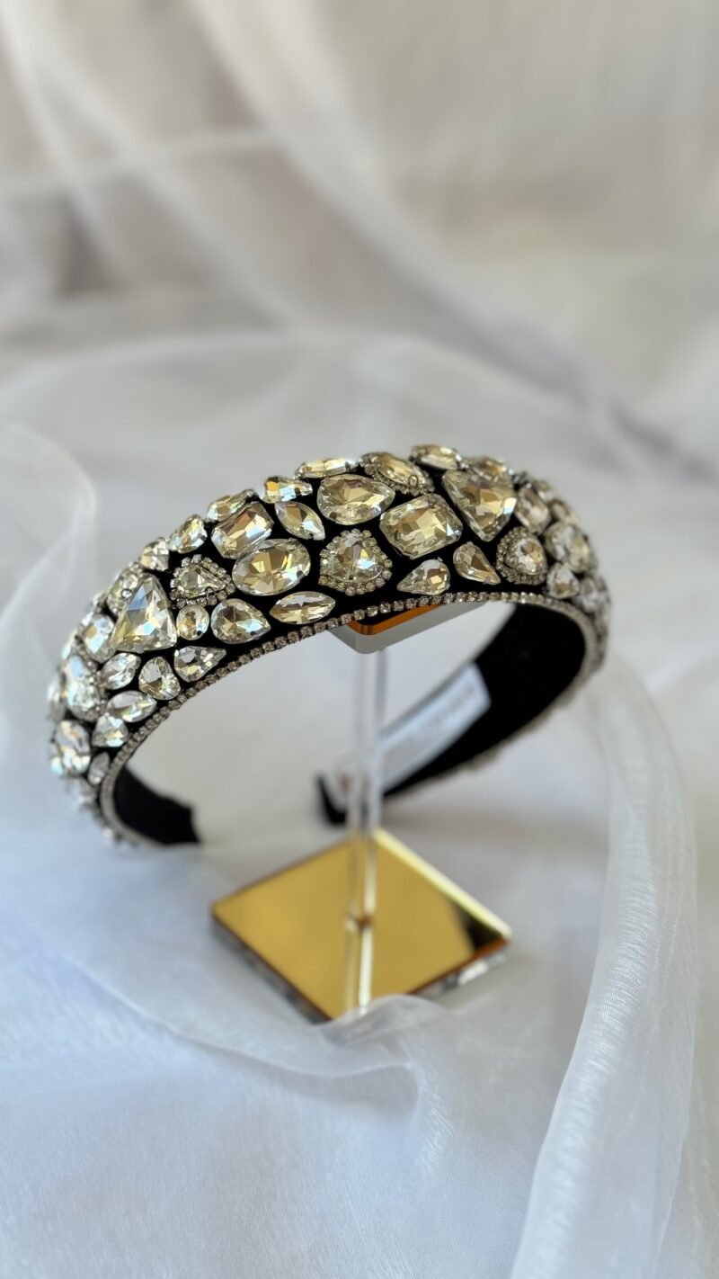 Nuestra diadema Anastasia, ahora en terciopelo negro con gemas plateadas sobre base plata, es el complemento que transforma cualquier look en pura sofisticación.