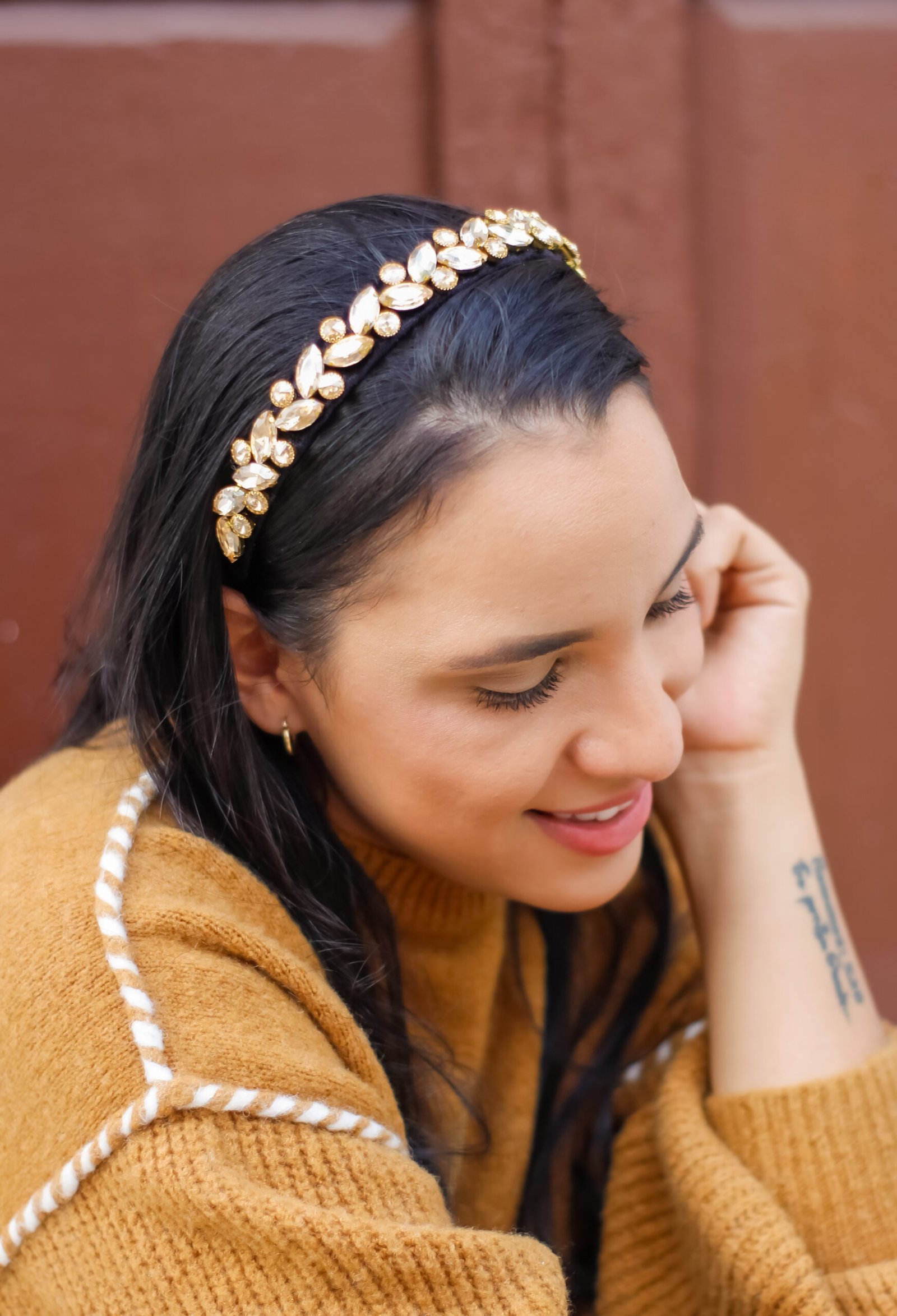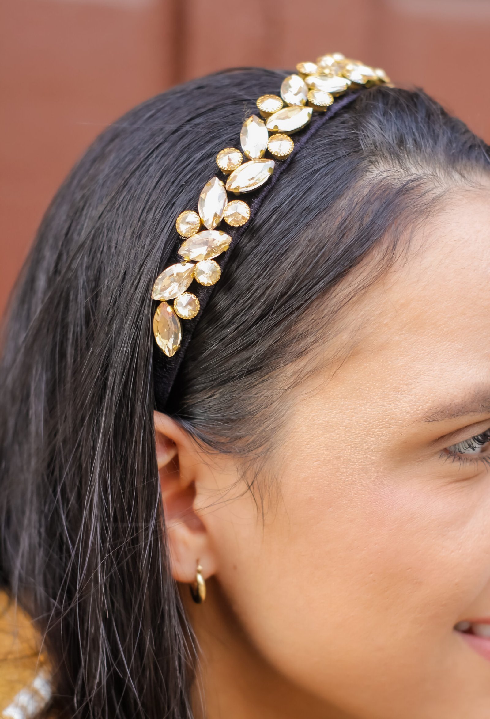 Diadema delgada 1.5 cm ancho, decorada de extremo a extremo con gemas de cristal en tono champang