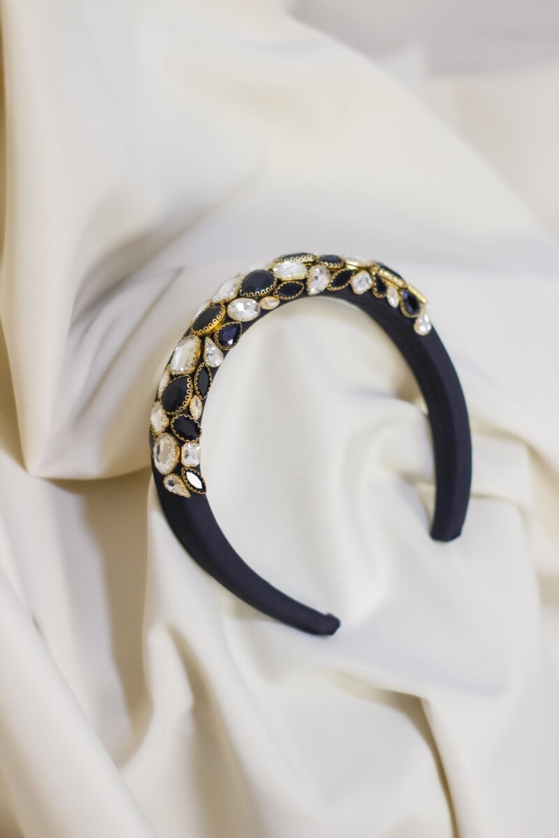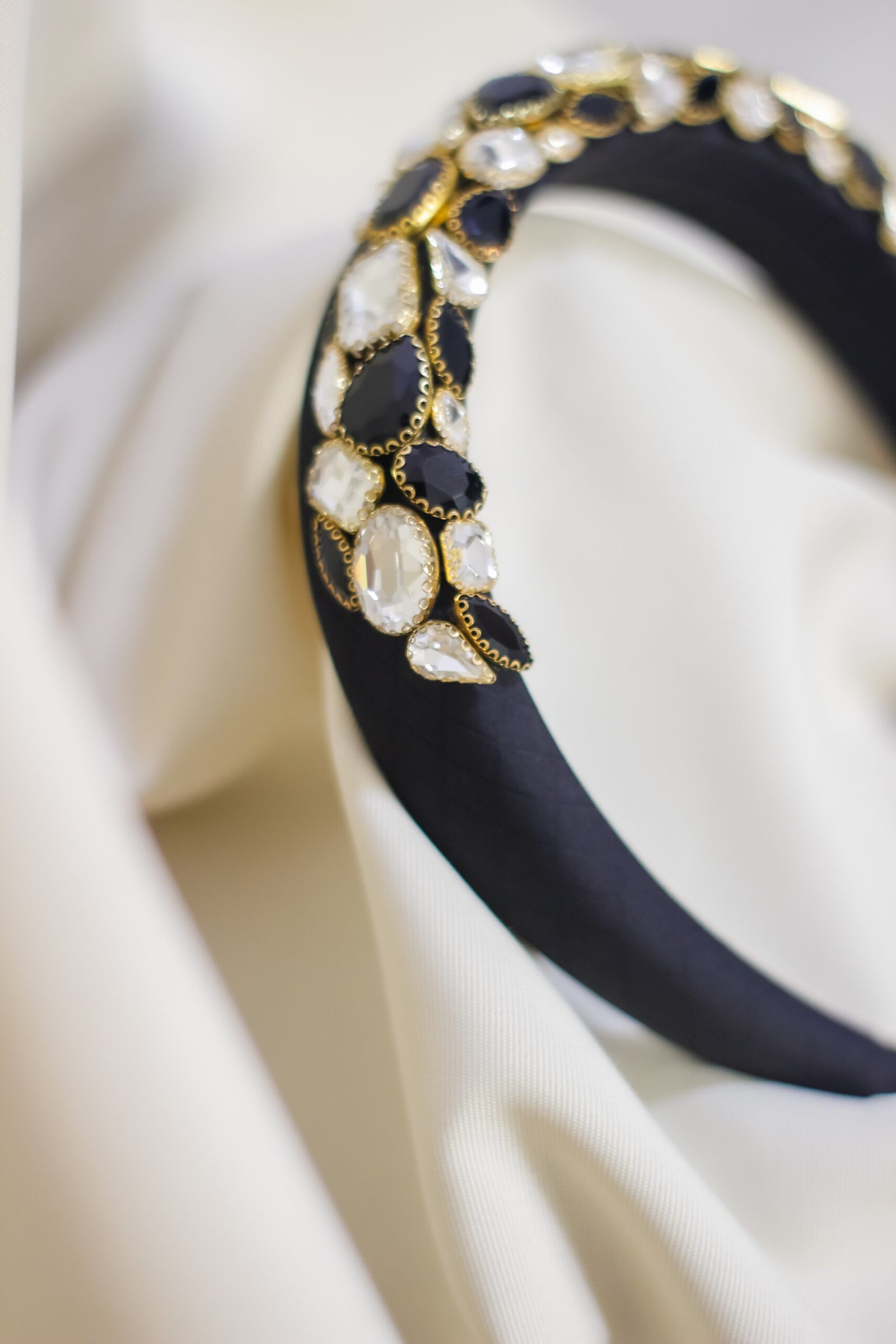 Nuestra diadema en tono negra es el lienzo perfecto para resaltar el brillo de las gemas en tono cristal y champang, que decoran su parte frontal con un destello vibrante y lleno de carácter.