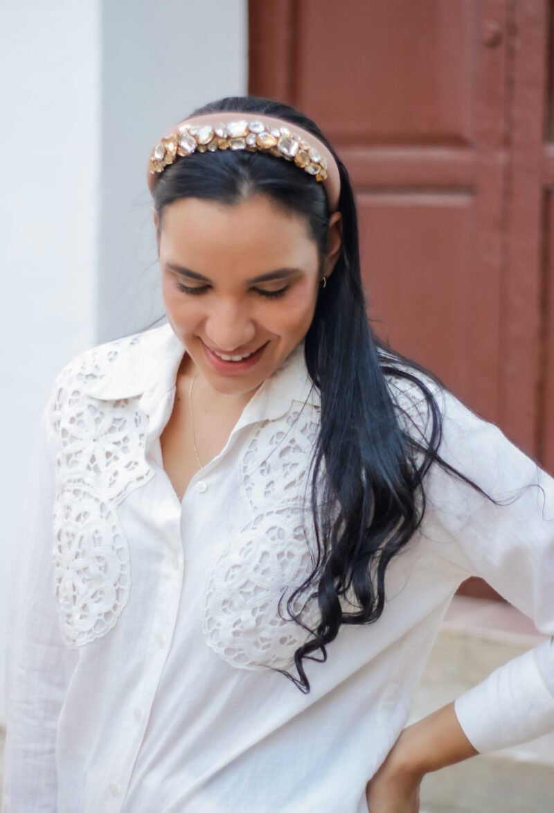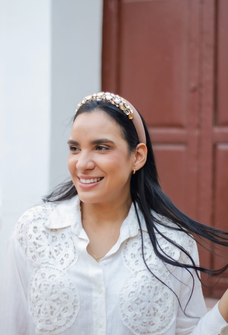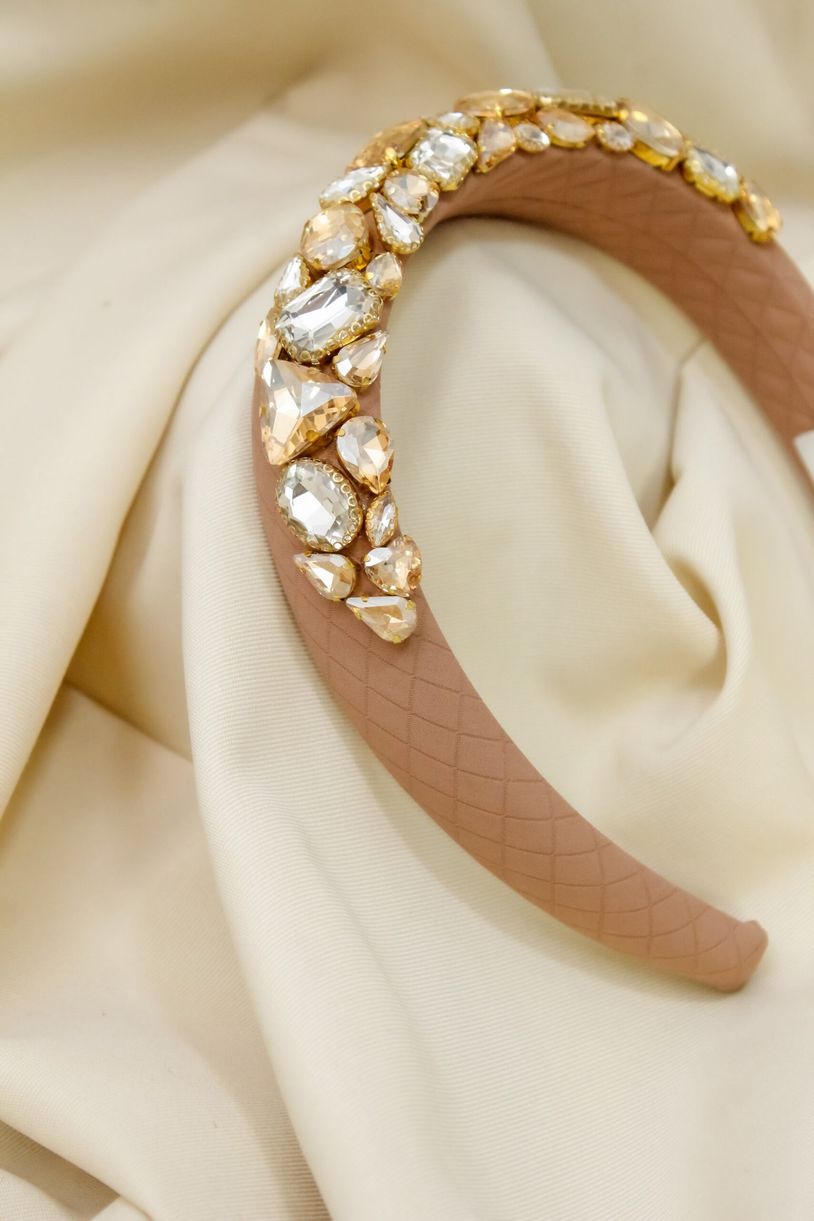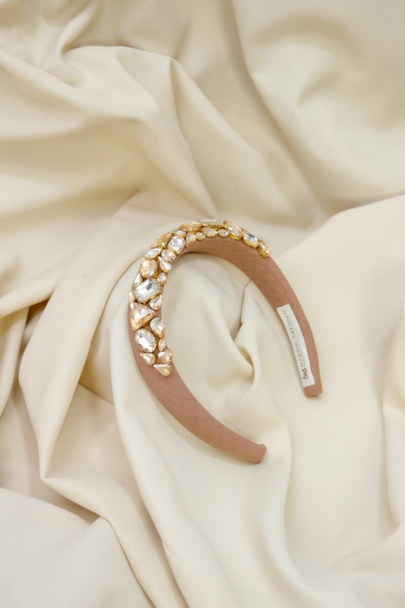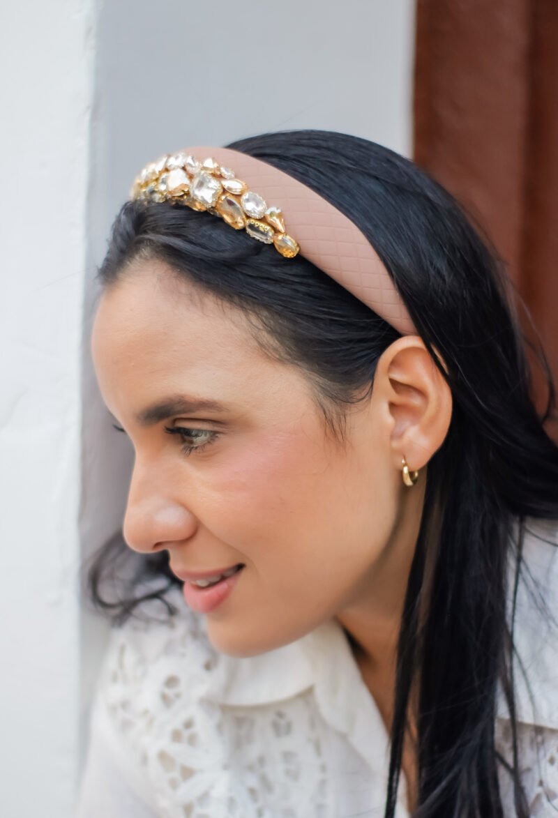 Esta diadema en tono palo de rosa es una joya que habla por sí sola. Su diseño delicado se realza con gemas de cristal en tonos champán y cristal, ubicadas en el frontal para capturar la luz con un brillo sutil y encantador.