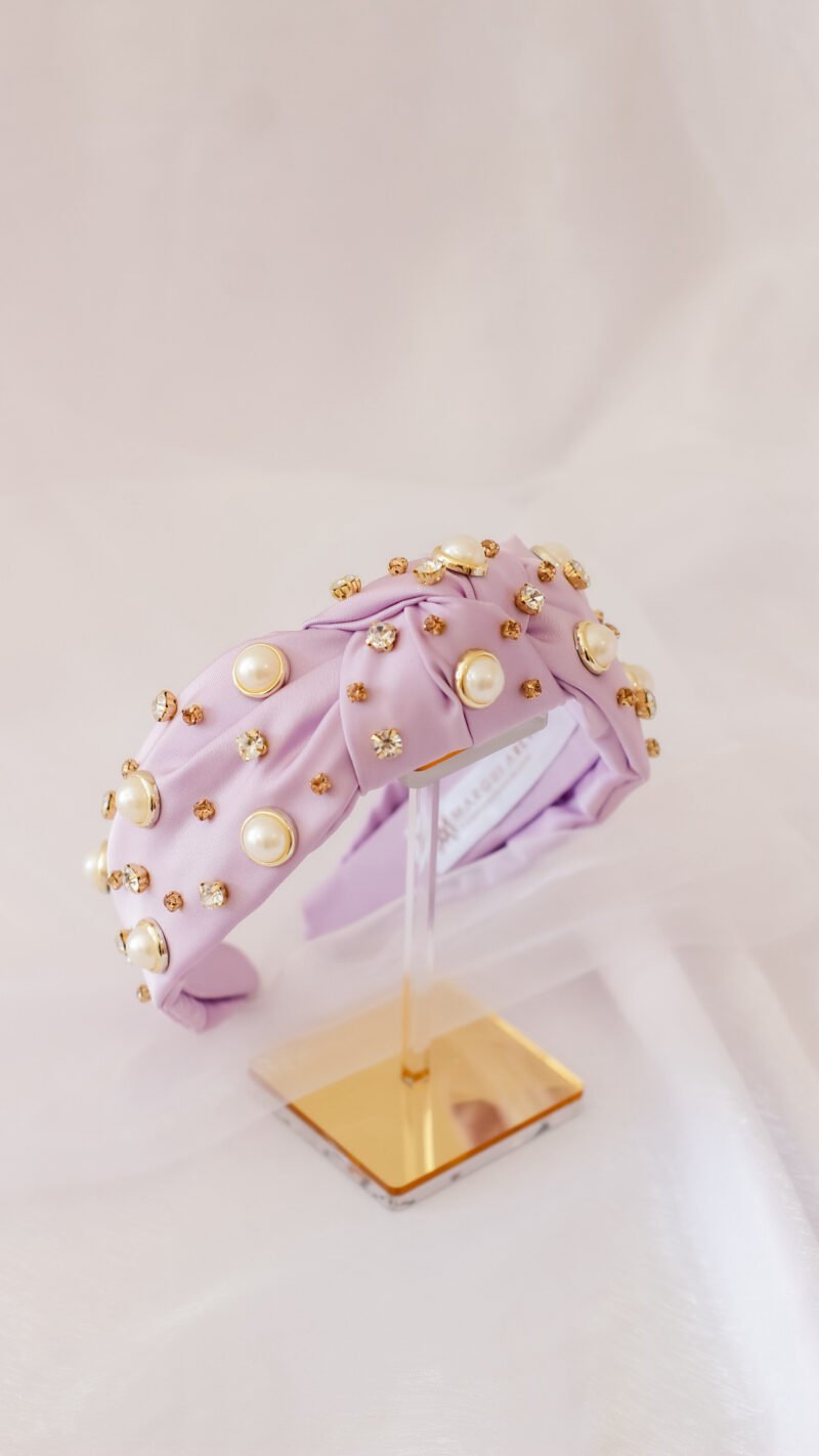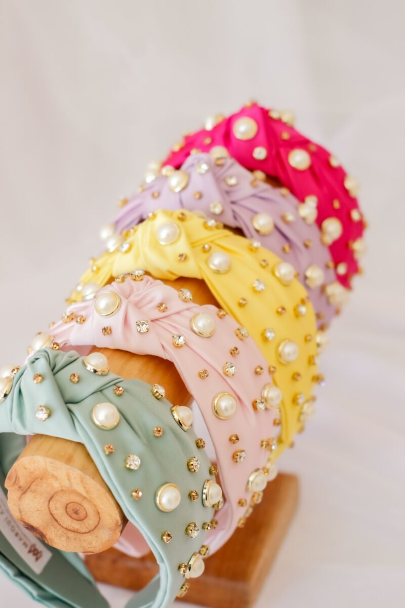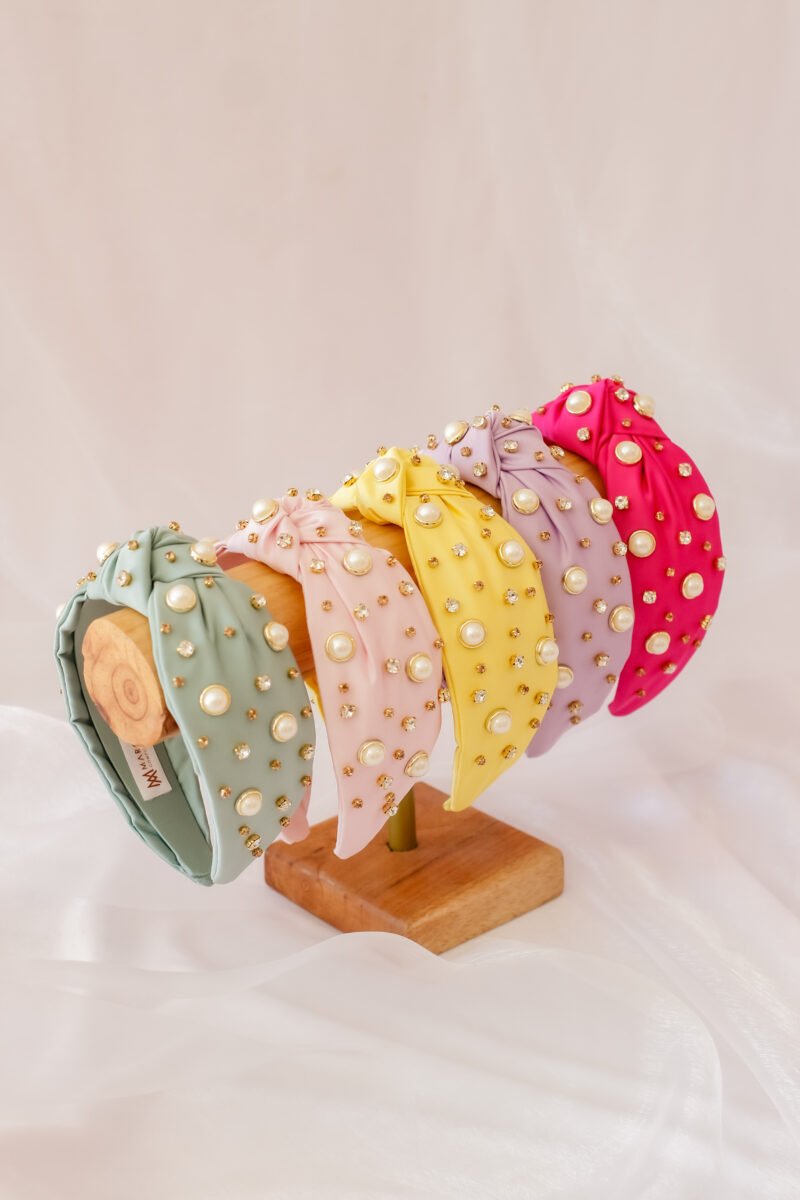 Diadema de 5cm aproximadamente de ancho, elaborada en una base de seda fina en distintos colores y decorada con media perla de borde dorado y gemas de cristal mini.