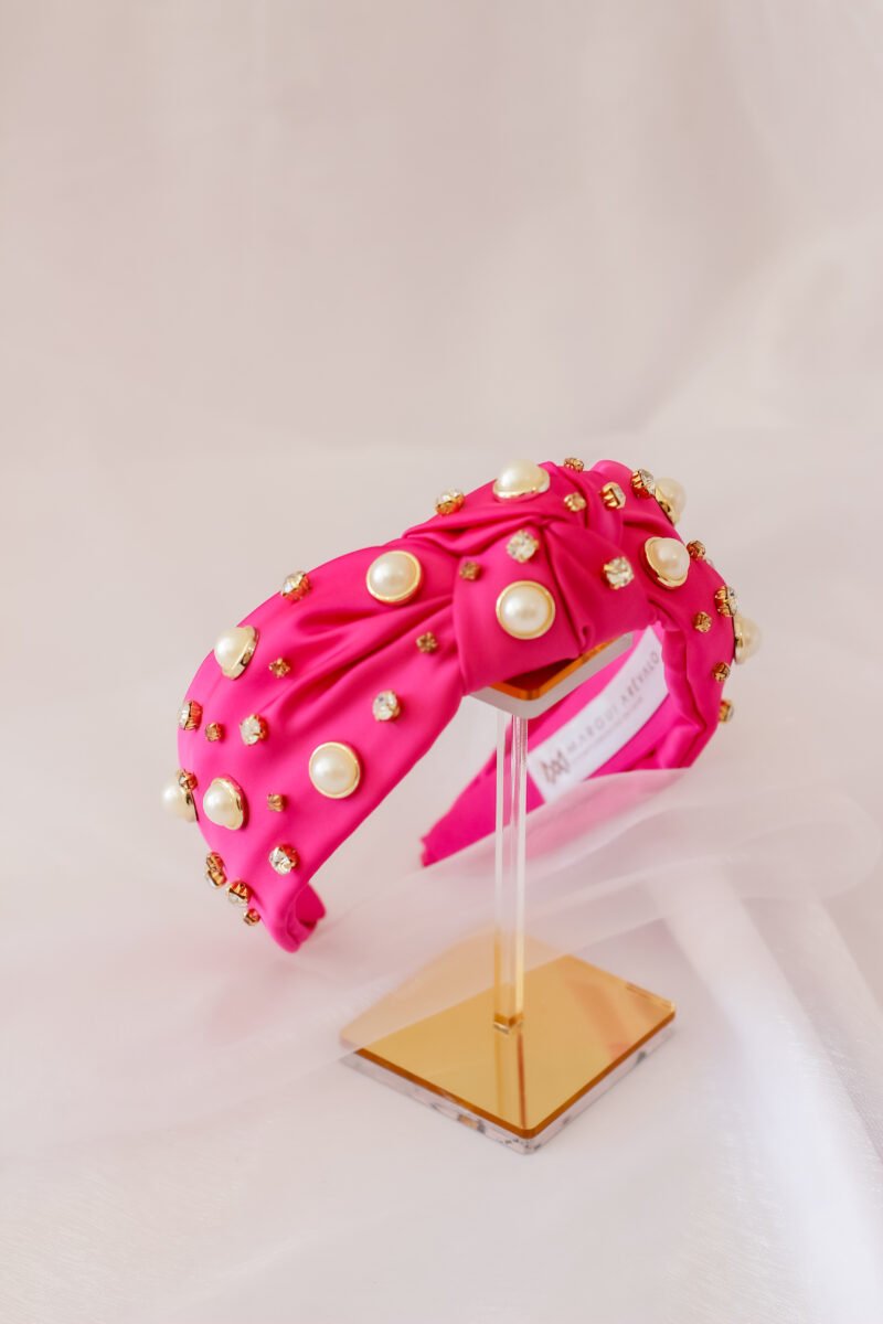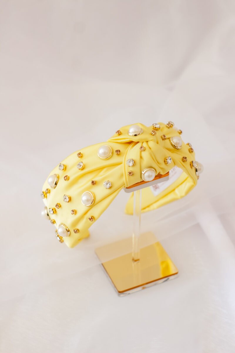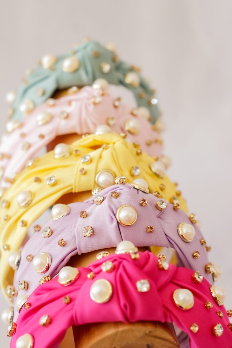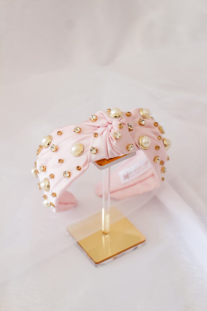 Diadema de 5cm aproximadamente de ancho, elaborada en una base de seda fina en distintos colores y decorada con media perla de borde dorado y gemas de cristal mini.