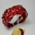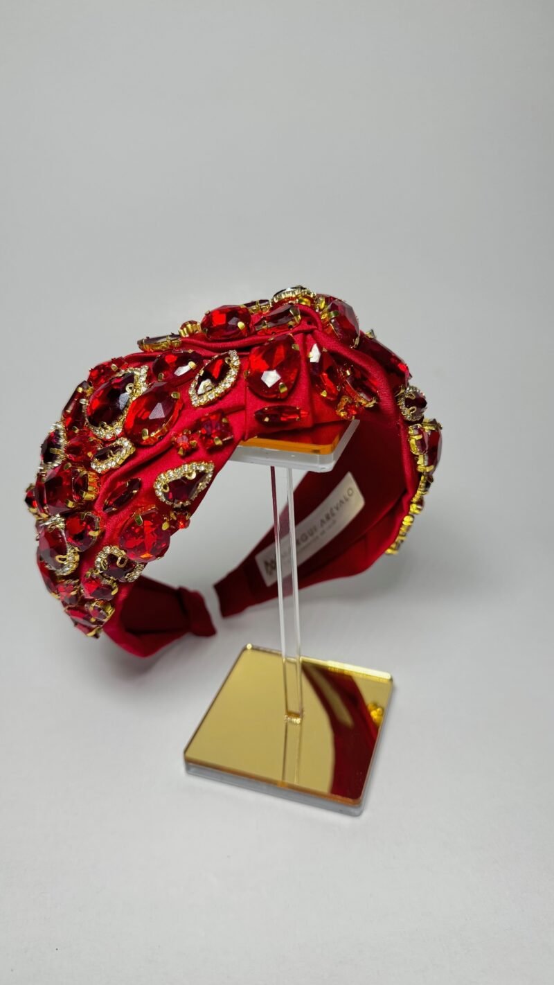 Diadema de 4 cm de ancho, elaborada en seda fina color rojo con atributo de nudo en el centro y decorada con finas gemas de garra dorada a su alrededor, y gemas de cristal en el mismo tono.