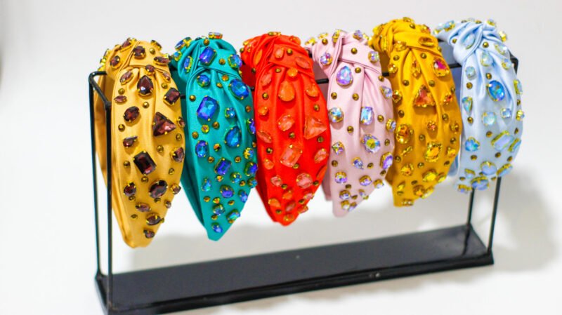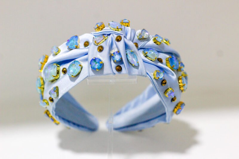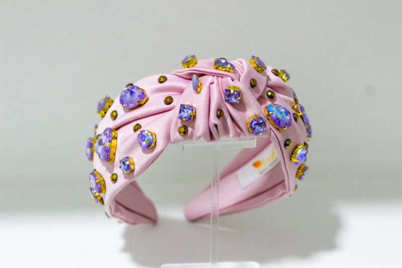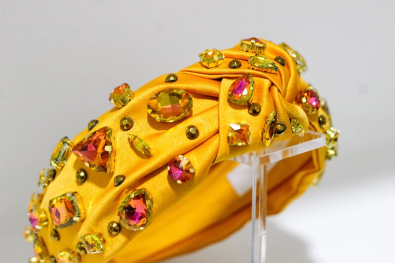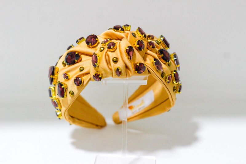 Diadema elaborada en tela, con diseño de nudo en el centro, con 5 cm de ancho, decorada con gemas de cristal y taches decorativos color ocre