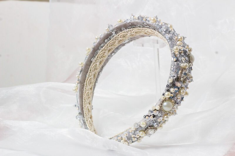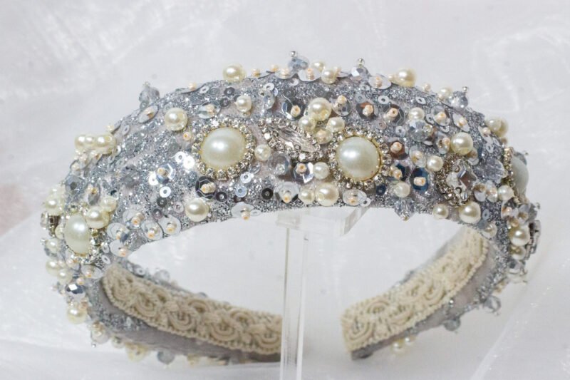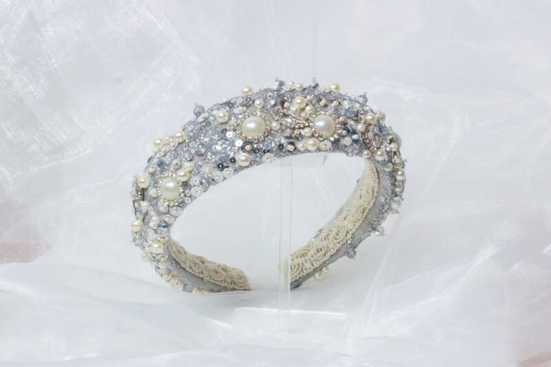 Diadema de 4 cm de ancho, elaborada en base de terciopelo de seda plateada, con una capa de gipiur fino, recamada con lentejuelas, gemas de cristal y herrajes de perla con bordes de cristal.