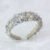 Diadema de 4 cm de ancho, elaborada en base de terciopelo de seda plateada, con una capa de gipiur fino, recamada con lentejuelas, gemas de cristal y herrajes de perla con bordes de cristal.