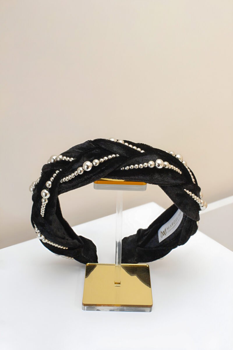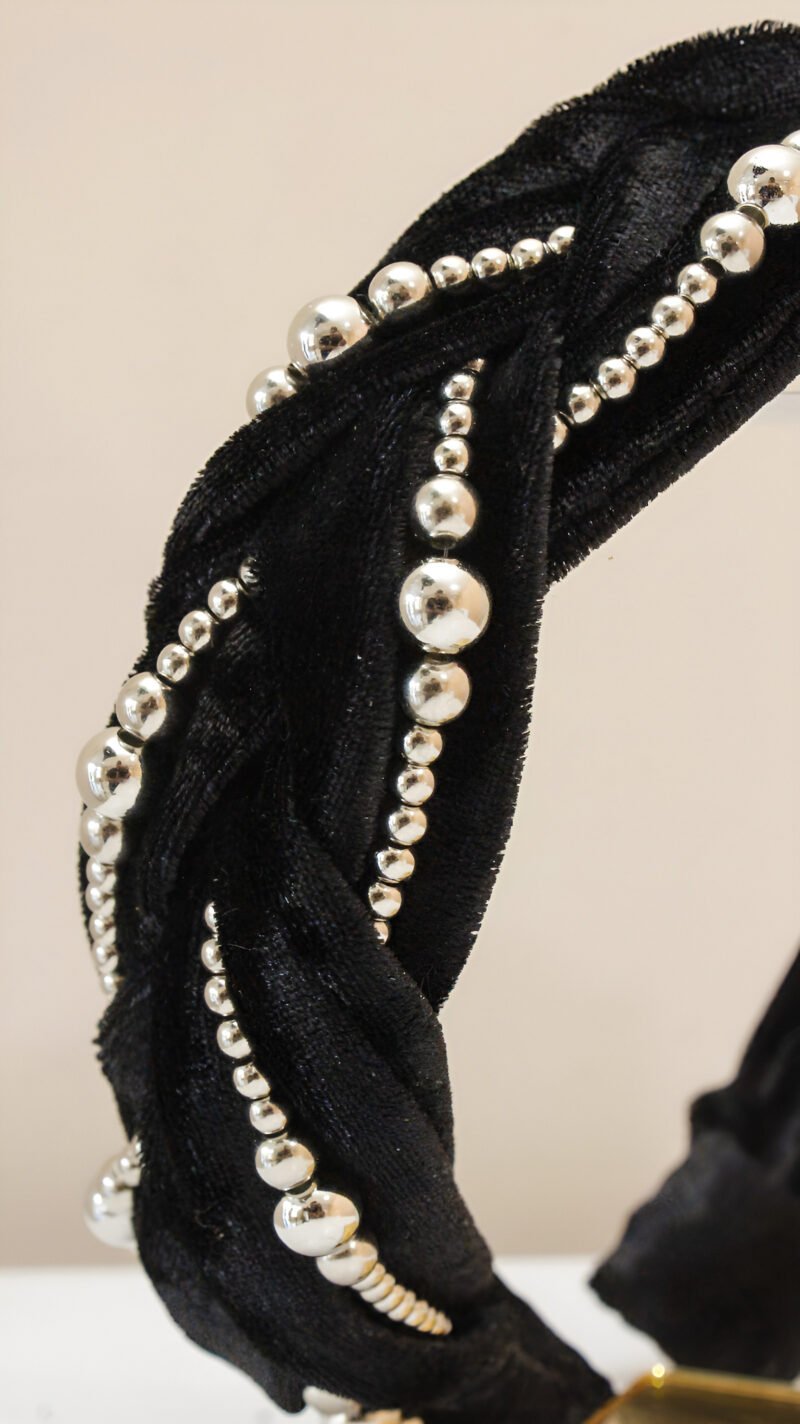 Diadema de 4 cm de ancho trenzada, elaborada en terciopelo negro, adornada con perlas de color plata.