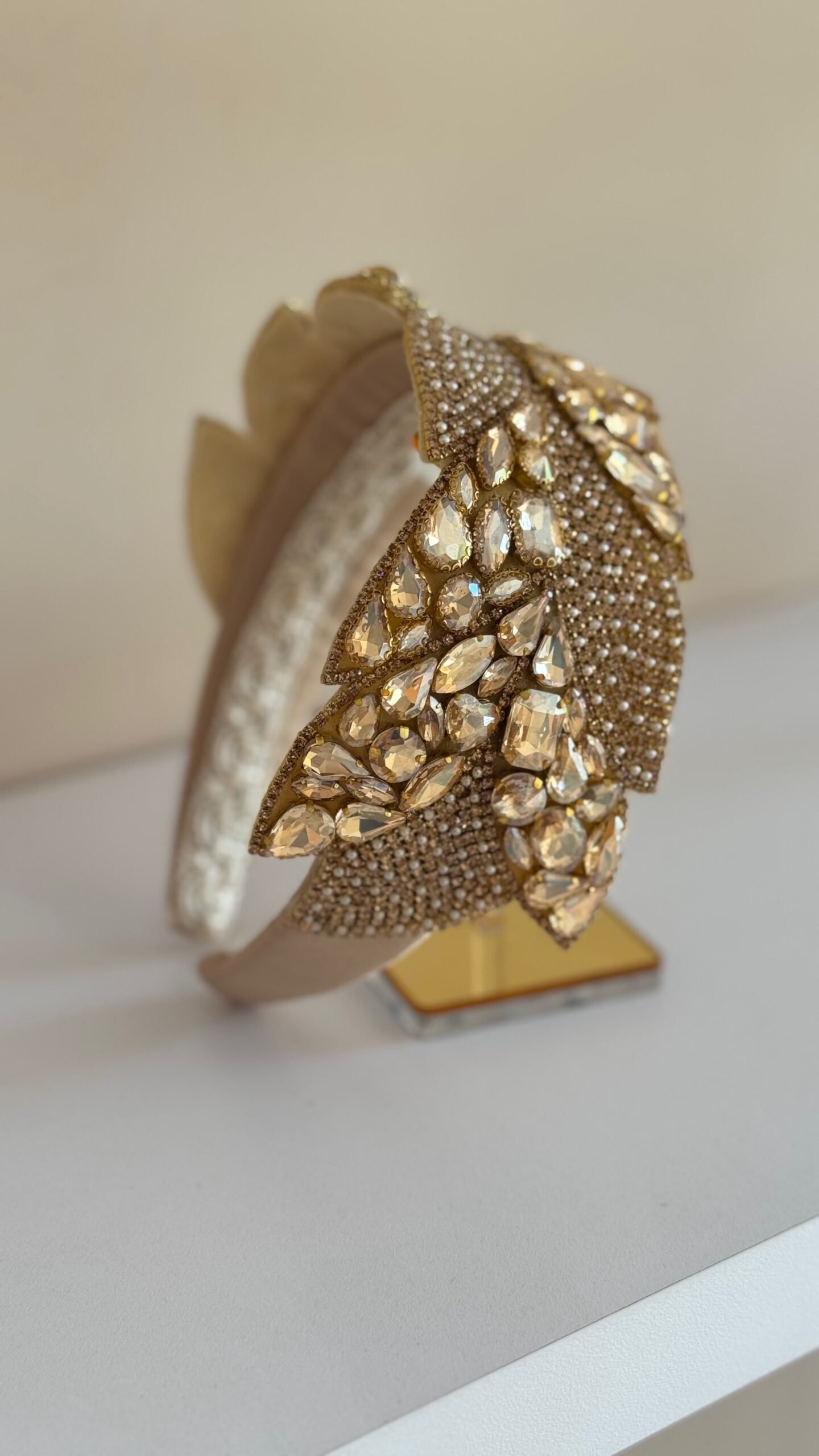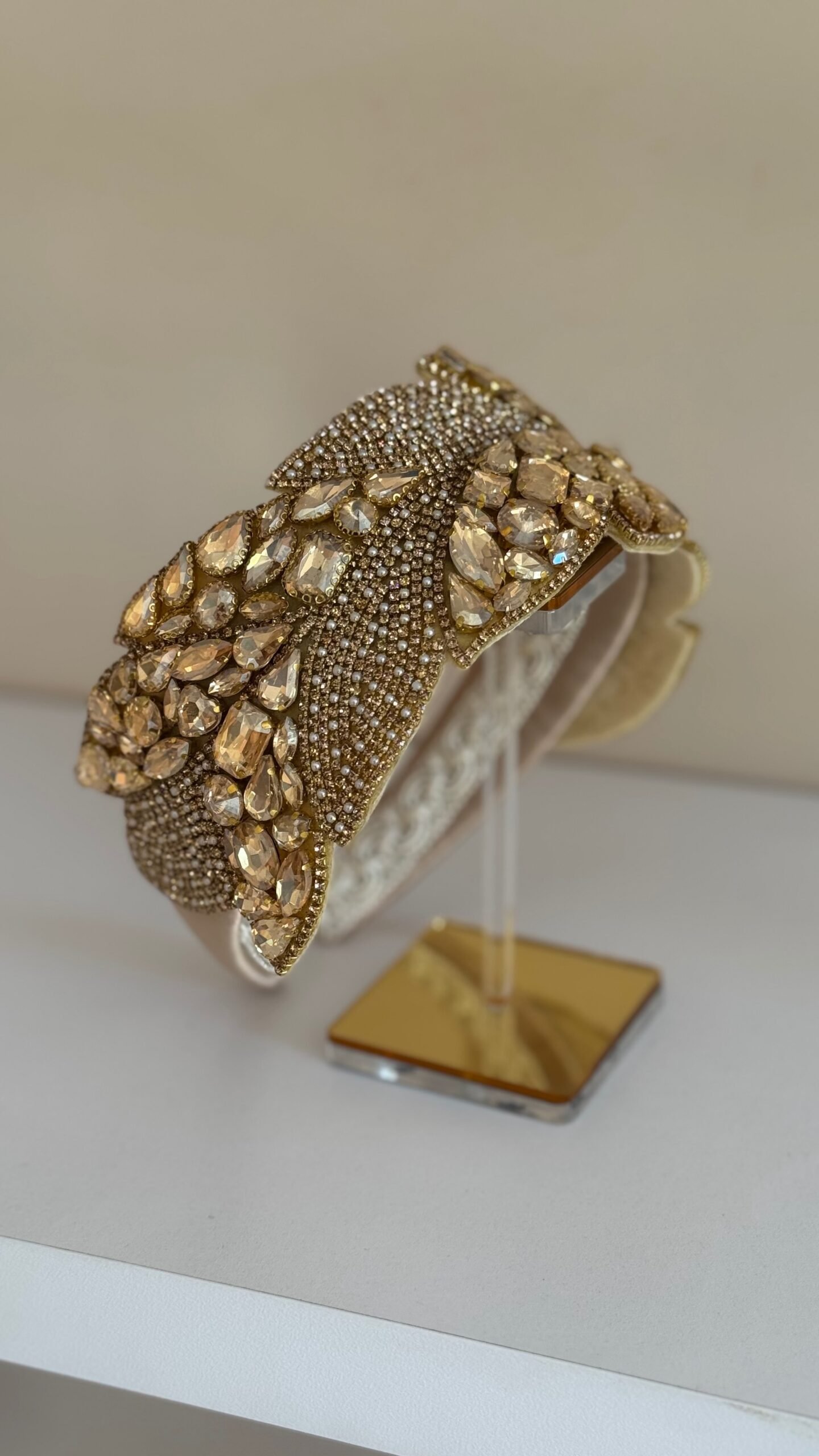Nuestra diadema tipo tocado en base dorada, con gemas de cristal y strass en tono champaña, es el complemento perfecto para quienes desean marcar la diferencia con un toque de lujo y sofisticación. Un diseño deslumbrante que ilumina cualquier look.