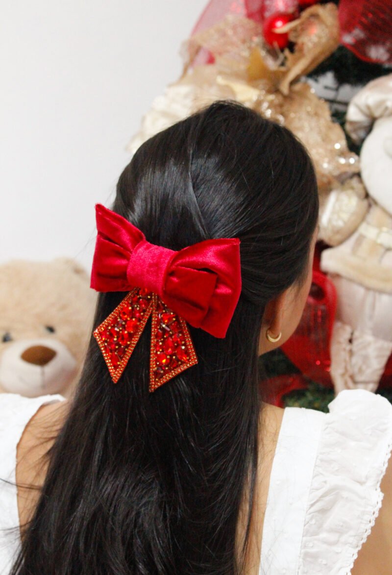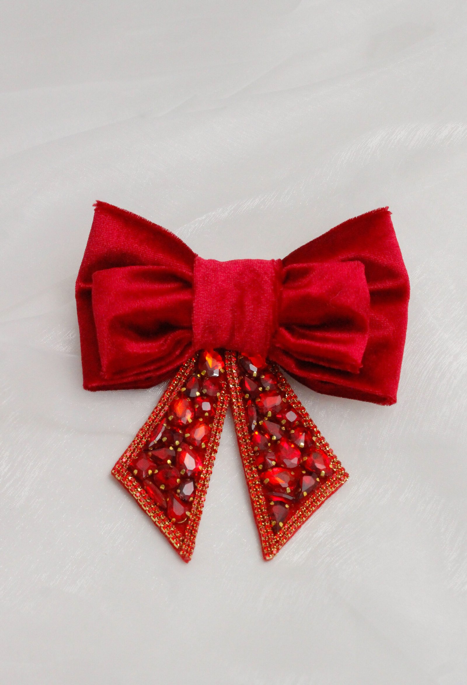 Descubre nuestro exclusivo lazo rojo de terciopelo, con una elegante cola adornada con gemas de cristal. 💎 Ideal para elevar cualquier look con un detalle único, sofisticado y lleno de estilo.