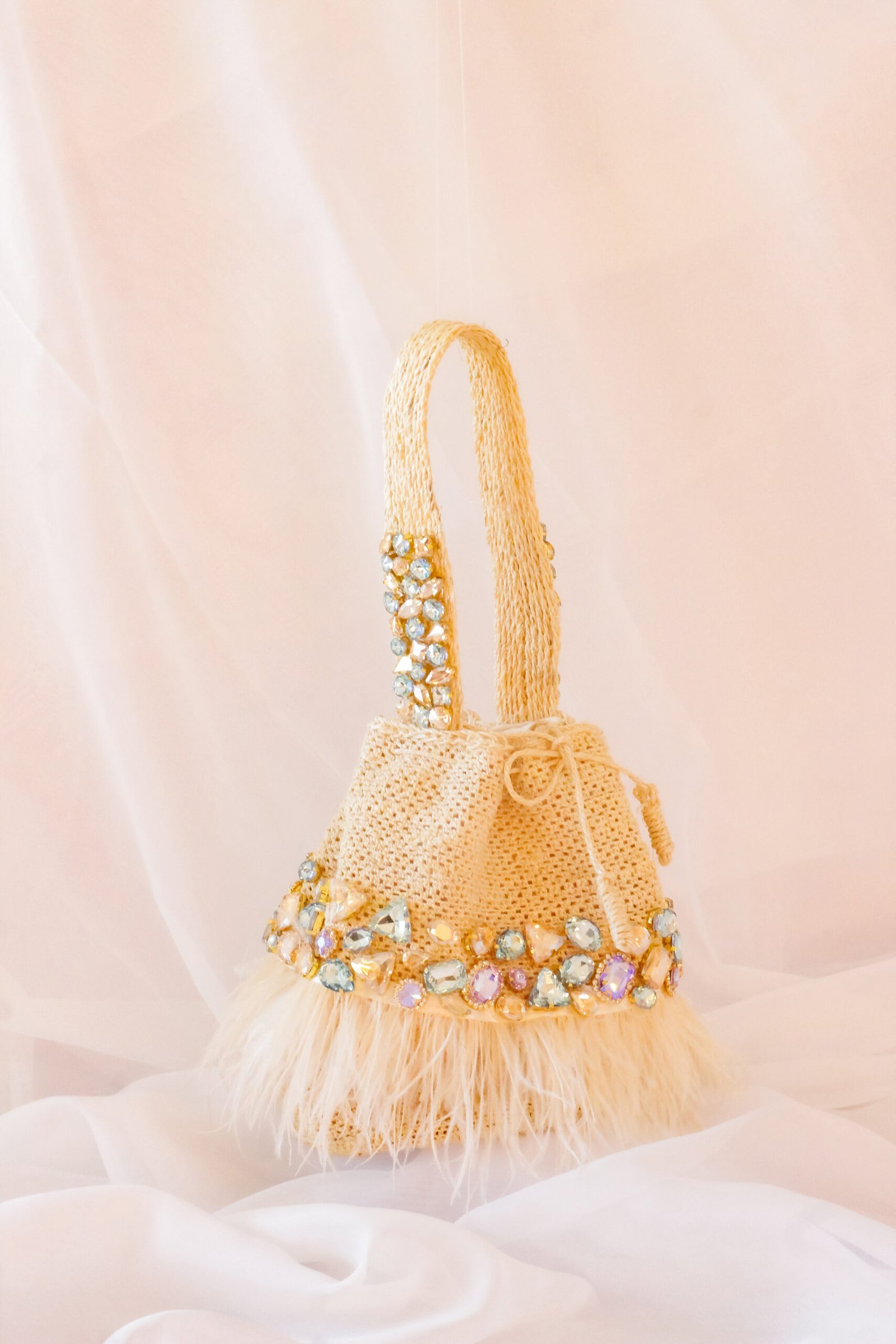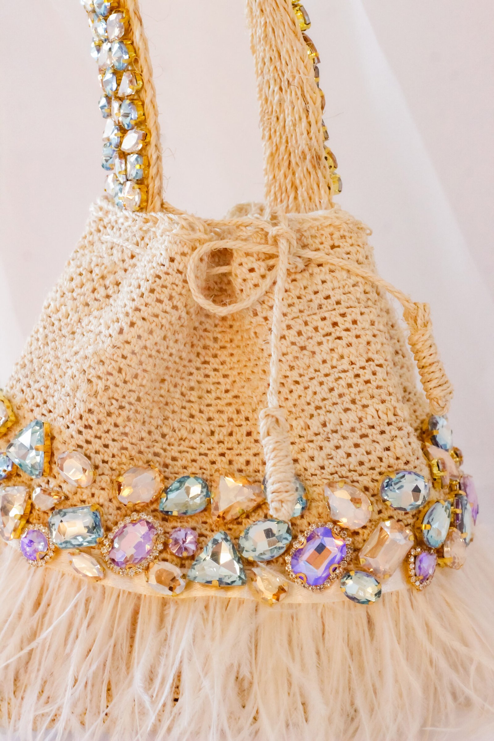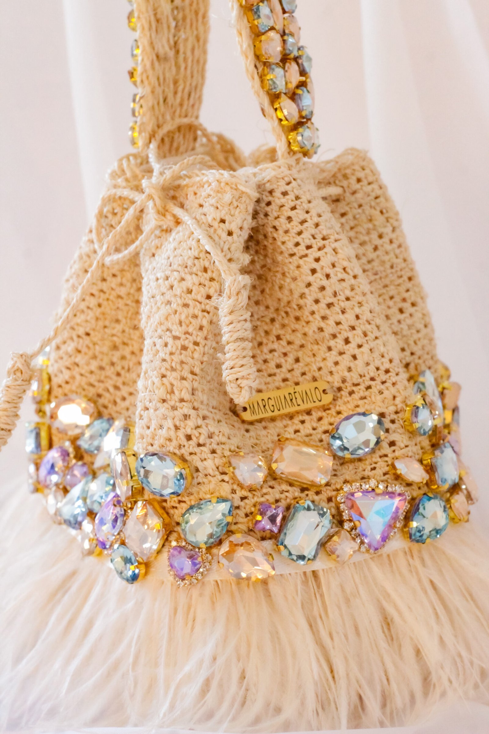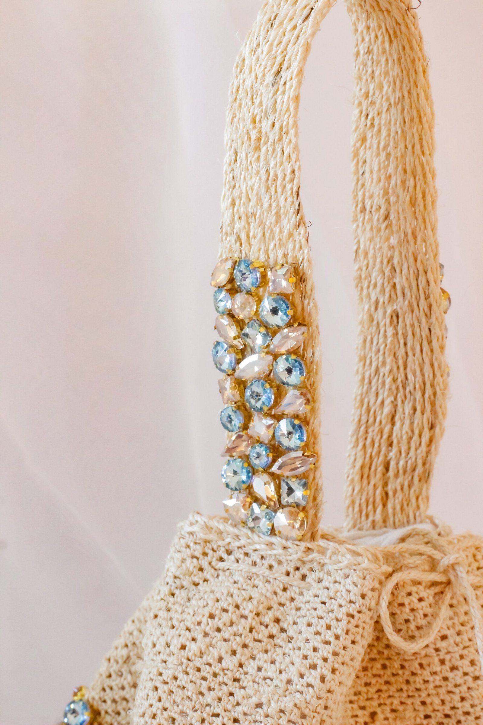 Sencillez y lujo se encuentran en esta mochila de fique. Con gemas de cristal que capturan la luz, es el complemento ideal para colgar en el brazo y llevar tu estilo a otro nivel.